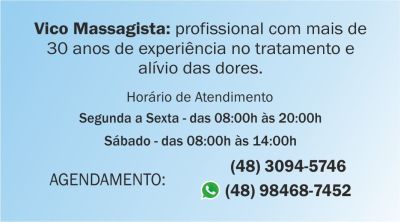 Vico Massagista atende em São José (SC). Oferece: quiropraxia, massagem terapêutica, massoterapia, ventosas e acupuntura. Profissional com mais de 30 anos de experiência no tratamento, alívio das dores e desconfortos em São José (SC)